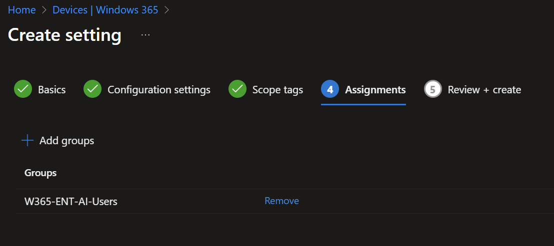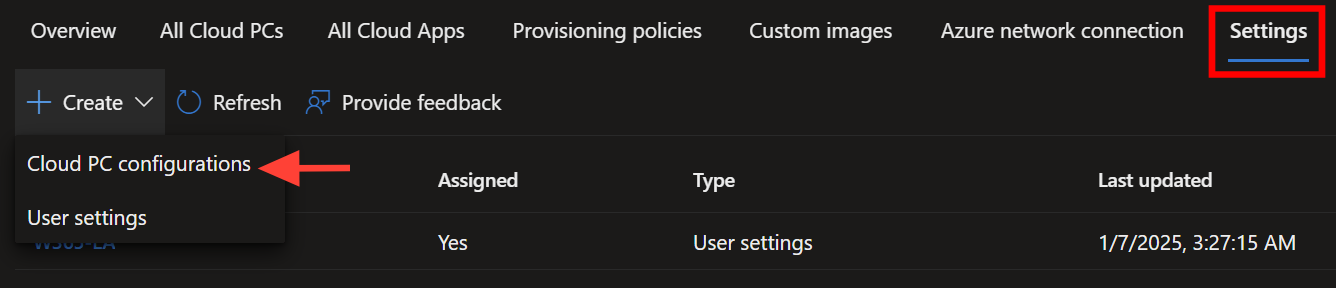 Devices > Windows 365 > Settings > Create > Cloud PC configurations