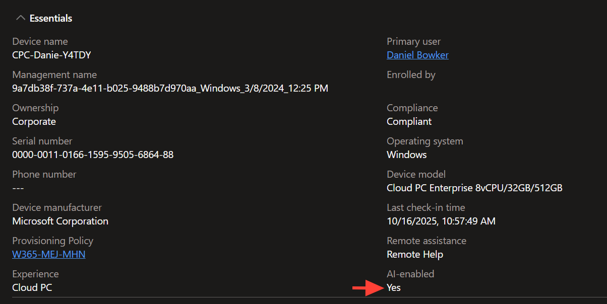 You can confirm the Cloud PC is AI-enabled in three places: